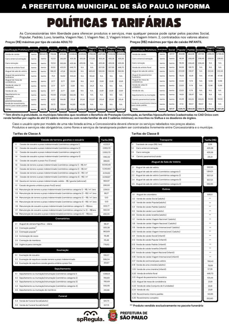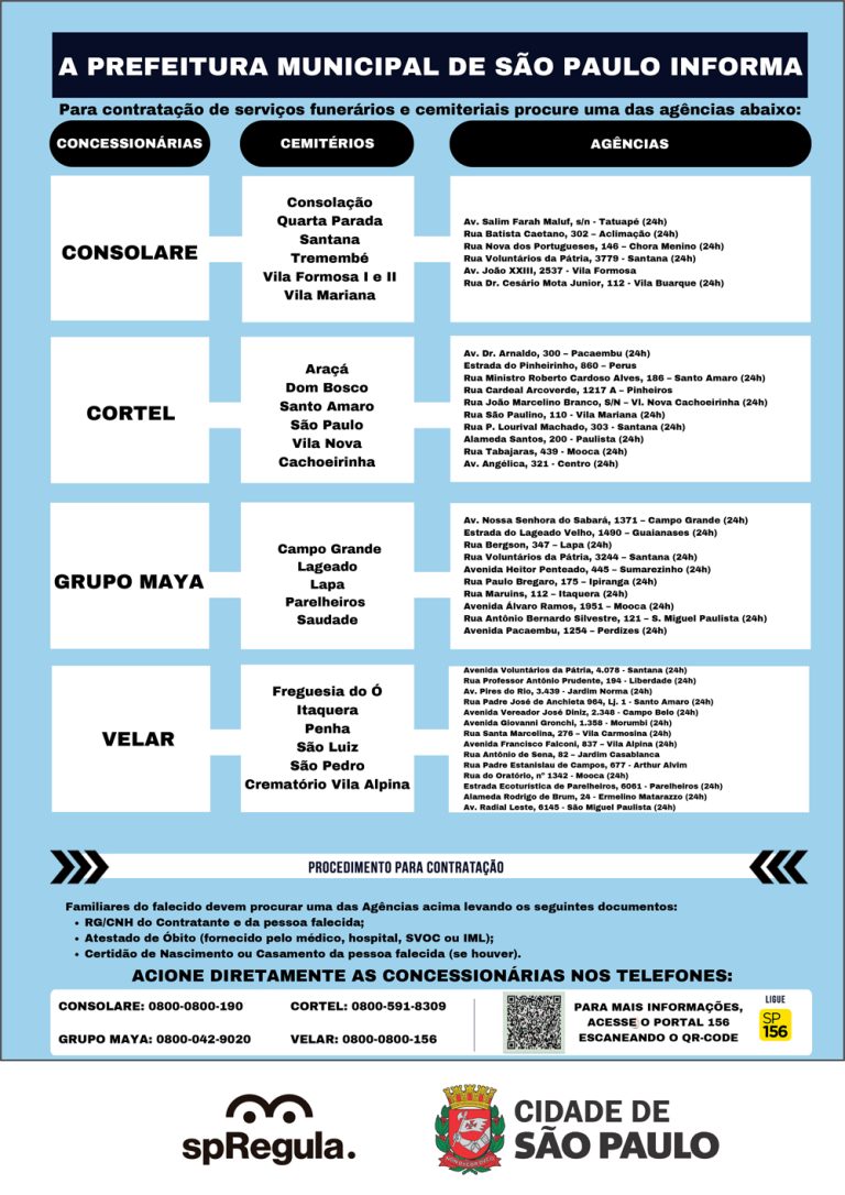 O serviço funerário do município de São Paulo, será atendido pelas seguintes concessionárias: